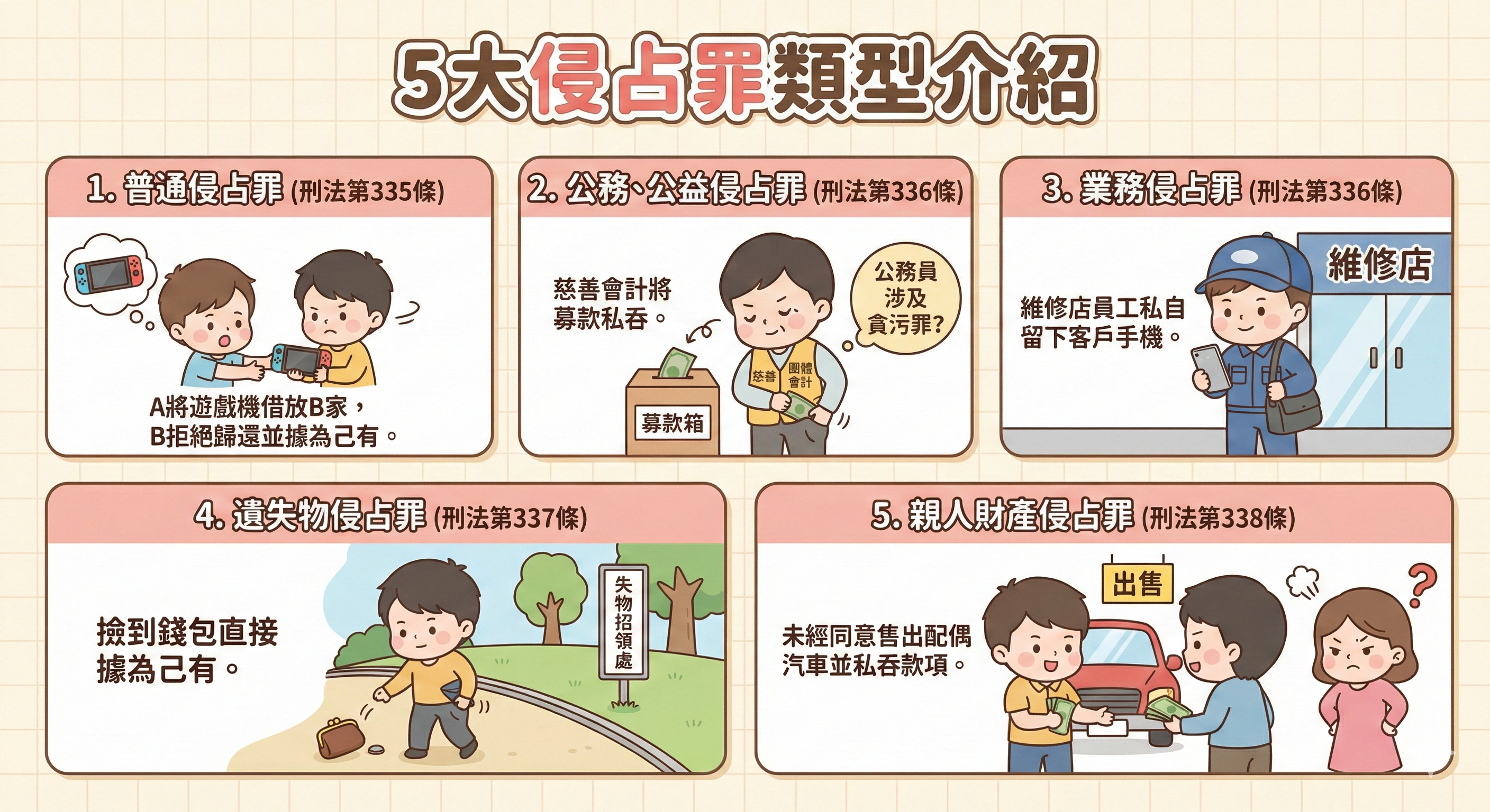 《刑法》第335~338條(普通侵占、公務/公益侵占、業務侵占、遺失物侵占、親人財產侵占)
