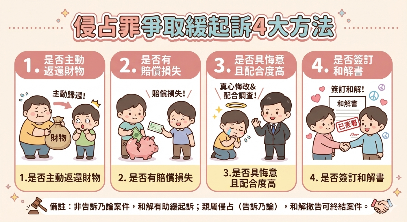 由於多數侵占案件屬非告訴乃論,故即便雙方和解,或被害人表示不再追究,程序也不會因此終止,但有機會可影響是否獲得不起訴、緩起訴處分以及日後量刑。但若為親人財產侵占,因屬告訴乃論,故若當事人達成和解並撤回告訴,案件即可終結。而在多數情況下,檢察官常會綜合以下要素來決定是否給予緩起訴處分: