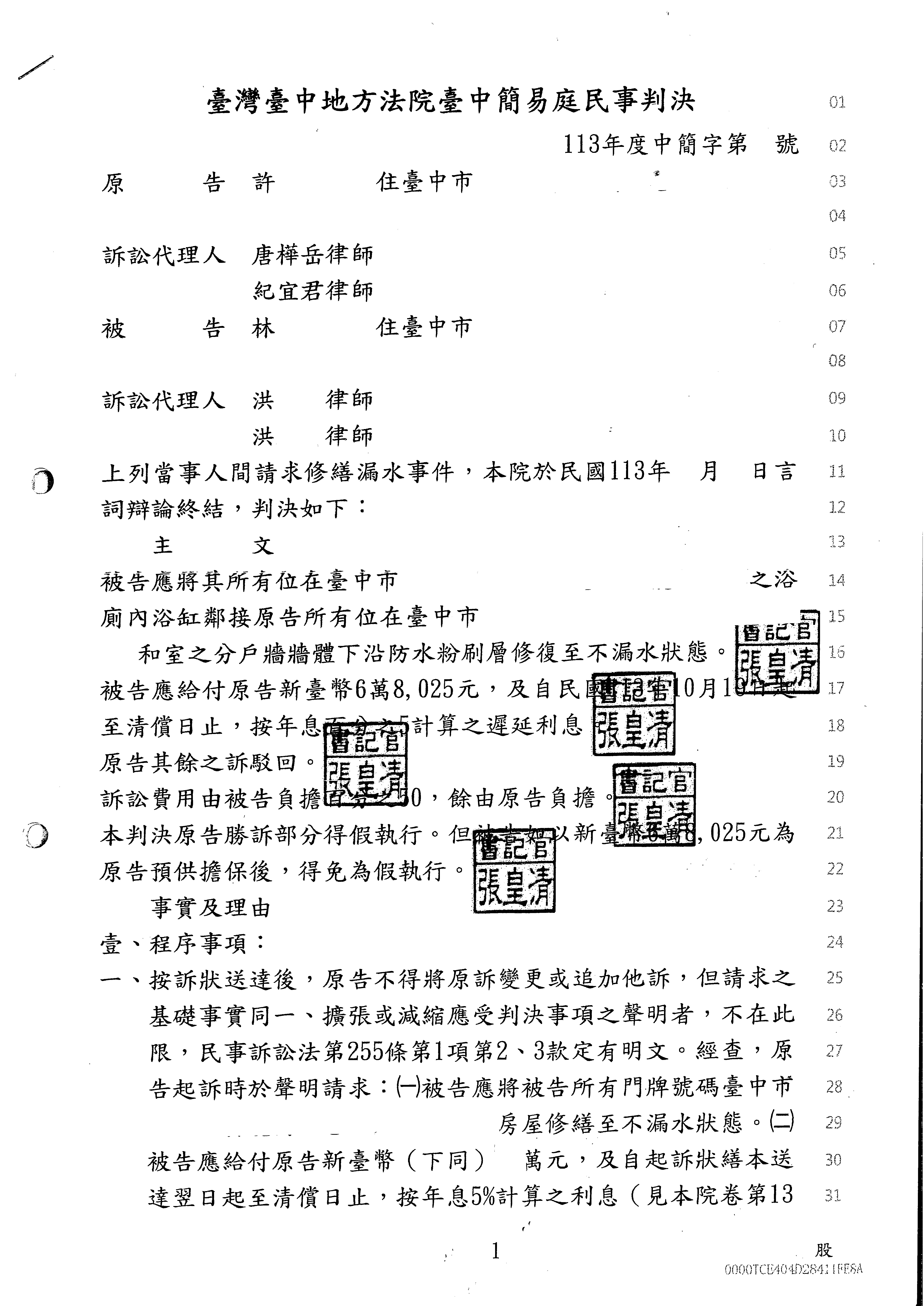 1. 👉被告應依循鑑定報告內之修繕方式將所有之不動產修複至不漏水狀態並賠償原告損失