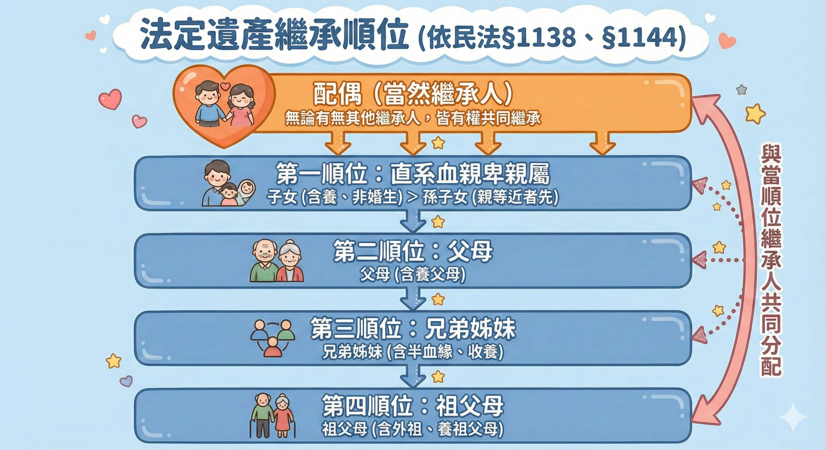 一、民法繼承順位圖解:配偶地位與血親4大順位