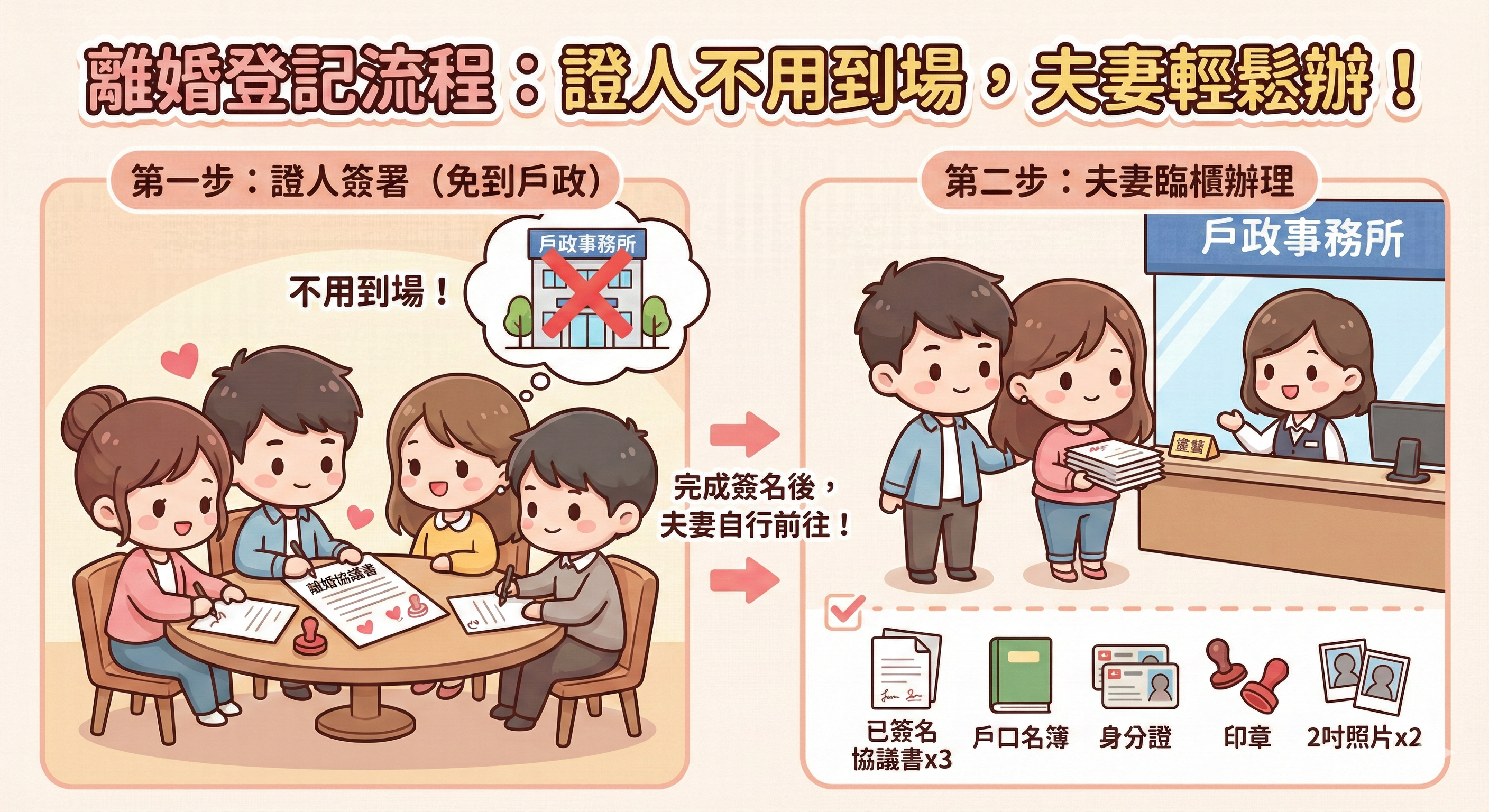 那辦理離婚登記時,證人需不需要一同到戶政事務所?答案是不用!離婚證人只需在簽署離婚協議書當下,與夫妻雙方同時確認並完成簽名即可,之後前往戶政事務所送件辦理時,僅須由夫妻攜帶文件臨櫃辦理,證人無須陪同到場。而辦理流程大致如下: