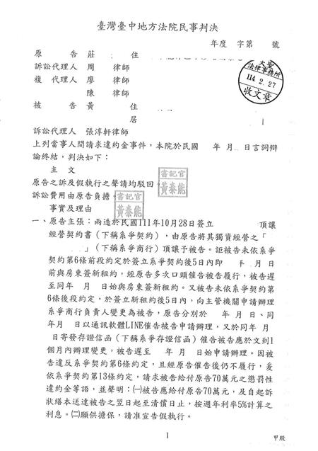 首頁 專業團隊 張淳軒 律師 成功案例 張淳軒 律師 擅長案件:詐欺、洗錢防制法、消費者債務清理程序、不動產案件、民事求償、強制執行程序 刑事案件 遭朋友利用錯當車手 爭取緩刑2年 當事人因朋友急需下,將提款卡提供給友人使用。爾後又在朋友的拜託下,將朋友匯款到當事人帳戶名下的款項領出。沒想到事後卻因為朋友非法使用提款卡,導致將當事人涉案被檢察官起訴。幸好在手足無措之際,找到「法律停看聽」的張律師,透過律師過往的辦案經驗和專業技巧,不斷的和受害者溝通協調,最終順利讓雙方達成共識和解,替當事人爭取到緩刑2年。 投資詐欺誤當車手 成功爭取緩刑4年 當事人因一時失慮,成為詐騙集團的車手,被檢察官提起公訴,幸好找到「法律停看聽」的張律師,在律師的幫助下,順利和告訴人協調溝通,當事人犯後也積極彌補造成的損害,終於和告訴人順利達成和解,最終律師也成功替當事人爭取到緩刑。 過失傷害成功達成和解 成功爭取不起訴 告訴人任職於當事人的工廠,工作過程中告訴人操作機器不慎而受傷,告訴人認為是當事人未盡管理義務才導致自己受傷,因而前往報警提告當事人。所幸當事人找到張律師,在律師的專業協助下,成功達成和解並讓告訴人撤告,讓檢察官同意給予當事人不起訴處分。 涉嫌虛擬貨幣洗錢案 成功爭取不起訴 當事人在網路上看到詐騙集團佯裝投資公司的貼文,在加入對方好友後,對方稱要提供帳戶讓公司操作而獲利。未料幾日後帳戶竟遭警示,當事人才驚覺自己遭詐騙集團利用。手足無措之下當事人找到「法律停看聽」的張律師,透過律師向檢察官證明當事人是誤信詐騙集團的話術,受到影響而陷入錯誤,成功替當事人爭取到不起訴。 涉犯偽造文書 成功爭取不起訴 當事人前往銀行提領其母親的遺產用以支付購入母親身故後靈骨塔之費用。孰料,其哥哥竟在事後提告當事人偽造文書。還好當事人找到「法律停看聽」的張律師,透過張律師的仔細蒐集證據、還原事實給檢察官知道,最終成功還當事人一個清白,替當事人爭取到不起訴。 涉犯詐欺案件 成功爭取不起訴 當事人和告訴人原先於網路交友軟體認識,某日當事人向告訴人借款1000元。詎料,當事人竟在日後突然收到警察局筆錄通知,指控當事人借款後便音訊全無,涉有詐欺的意圖。幸好當事人有找到「法律停看聽」的張律師,透過律師協助說服檢察官係當事人操作軟體不慎誤刪和告訴人的聊天室,並無詐欺的意圖,成功幫當事人爭取到不起訴,還給當事人一個清白。 違反毒品危害防制條例 成功爭取不起訴 當事人因持有並施用第二級毒品後遭警方發現,幸好一時失慮的當事人找到「法律停看聽」的張律師,透過律師向檢察官說明當事人施用的地方為國外及驗尿反應為陰性,並無我國刑法上的適用,成功說服檢察官給予被告不起訴的處分。 槍砲彈藥刀械管制條例 成功爭取不起訴 當事人和同案被告遭警方搜索時查獲槍械及子彈,係因證人出庭時表示當事人曾碰觸過該槍枝,所以應該為當事人所有。 當事人無奈之下找到張律師協助,透過張律師專業的答辯及提供當事人和同案被告間的對話紀錄,表示本案的槍枝應為同案被告所有,成功說服檢察官給予當事人不起訴的處分。 涉犯背信罪 成功爭取不起訴 當事人承攬對方的房屋裝潢工程,但房屋係因遭主管機關認定為違建而需停工,過程中對方並不知情只認為當事人已收受款項卻不履約,便提告當事人背信罪,當事人便找到張律師協助,透過張律師專業的答辯及提供主管機管針對該房屋所核發的相關違建文件,成功說服檢察官給予當事人不起訴的處分。 民事案件 確認本票債權不存在 成功爭取票權不存在 當事人係遭對方威脅才簽立本票,事後趕緊向熟悉民事糾紛的張律師求助,最後在律師協助下,證明本票的簽立是違反民法上的規定,成功替當事人爭取到票權不存在。 損害賠償 法院同意當事人提供擔保後,予以假扣押 當事人因為土地遭到數名被告傾倒廢棄物,造成土地無法正常使用,須支出高額清理費用始得清除。為確保當事人不會因訴訟時間過長,給予被告脫產時間。因此,張律師在受理案件後,馬上替當事人具名理由向法院聲請假扣押,成功保障當事人日後的求償權益。 侵占公司款項的損害賠償 成功爭取損害賠償 被告任職於當事人所開設的公司,被告係因行使職務時將原本應該繳納回公司的款項占為其所有,金額高達數百萬,因此當事人便找到張律師的協助,成功協助當事人追討回遭侵占的款項。 債務糾紛 被告應履行協議 當事人和被告為兄妹,被告答應當事人在期限內會將原先存放於帳戶的母親遺產應繼分得部分給付給當事人,事後被告卻推託遲未給付,無奈之下當事人找到「法律停看聽」的張律師,透過張律師的專業協助下,成功替當事人討回應得的應繼分部分。 分割共有物 成功替當事人將共有物分割並爭取到希望分配之部分 當事人和其他共有人共有數房屋,但遲未在分割方式上達成共識。為確保日後權利行使明確,所以找到張律師,替自己向其他共有人提出希望的不動產分割方案,最後也成功說服其他共有人,表示當事人提供的分割方法是最符合經濟價值、侵害最小下,同意依照當事人的方案進行分割及取得分割後不足價金之差額 修繕漏水事件 成功爭取精神慰撫金及被告應支付裝潢修繕的費