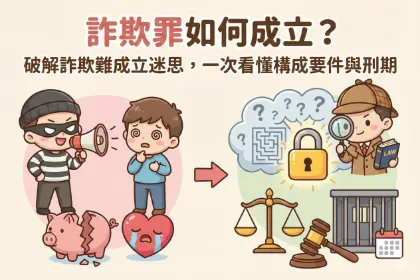 首頁 法律知識文章 案件類型: 不拘 刑事專區 民事案件 家事案件 車禍案件 勞資專區 債清專區 律師說故事 身份: 不拘原告被告 關鍵字: 搜尋 刑事專區 詐欺罪如何成立?破解詐欺難成立迷思,一次看懂構成要件與刑期 詐欺罪很難成立嗎?要如何證明對方是詐欺?想知道詐欺罪指的是什麼,其構成要件又有哪些,下面就讓我們為你整理詐欺罪的定義、各類詐欺手法與刑責,帶你破解詐欺罪難成立的迷思,並分享常見案例,避免讓你踏進陷阱,不小心成為「詐欺犯」! 2026-01-21 不拘 刑事專區 帳戶被警示怎麼辦?律師教你從恐慌到自救的3個心態與步驟 當你發現帳戶被警示的那一刻,內心的恐慌與無助,我們完全理解。別擔心,這篇文章的目的,不是要再給你一堆難懂的法條,而是要從心態與行動兩個層面,一步步帶領你走出迷茫,找回應對的勇氣。 2025-10-27 被告 刑事專區 告誡帳戶是什麼?告誡戶有什麼限制?律師教你快速解除告誡! 洗錢防制法第22條規定,任何人不得將自己或他人向金融機構申請開立之帳戶、向提供虛擬資產服務或第三方支付服務之事業或人員申請之帳號交付、提供予他人使用。若有發生前述情形者,則在被通知作筆錄時,警察會開立告誡單給你,後續也會影響你使用帳戶。 2025-09-21 被告 刑事專區 被告詐欺如何自保?專業律師免費諮詢,傳授自保方法! 收到警局筆錄通知怎麼辦?收到傳票一定要去開庭嗎?不去開庭會怎麼樣?筆錄該怎麼做才能保障自己?事後跟告訴人和解是一個好方法嗎?被判詐欺罪後會怎麼樣呢?需要進去關嗎?關於各式詐欺罪可能面臨到的問題,律師這篇文章一次跟你大解密! 2024-05-22 被告 律師說故事 小心求職陷阱! 詐騙集團手法層出不窮,過往購買或租借帳戶的方式不僅容易被警方查緝,更因為民眾金融知識逐漸普及,也清楚交易帳戶是有疑慮的,所以詐騙集團開始以工作、投資、家庭代工等話術欺騙民眾成為人頭帳戶。那麼究竟律師是如何協助民眾答辯的呢?就讓我們看下去! 2025-08-28 不拘 刑事專區 被懷疑洗錢怎麼辦?律師教你如何查詢是否為警示帳戶與帳戶凍結原因 現行詐騙手法日益猖獗,許多民眾因不熟悉法律、金融知識,而誤信詐騙集團的話術,進而提供自己的個人資料及帳戶出去。以下將透過本文帶大家認識警示帳戶、以及變成警示帳戶後,又該怎麼處理? 2025-09-12 被告