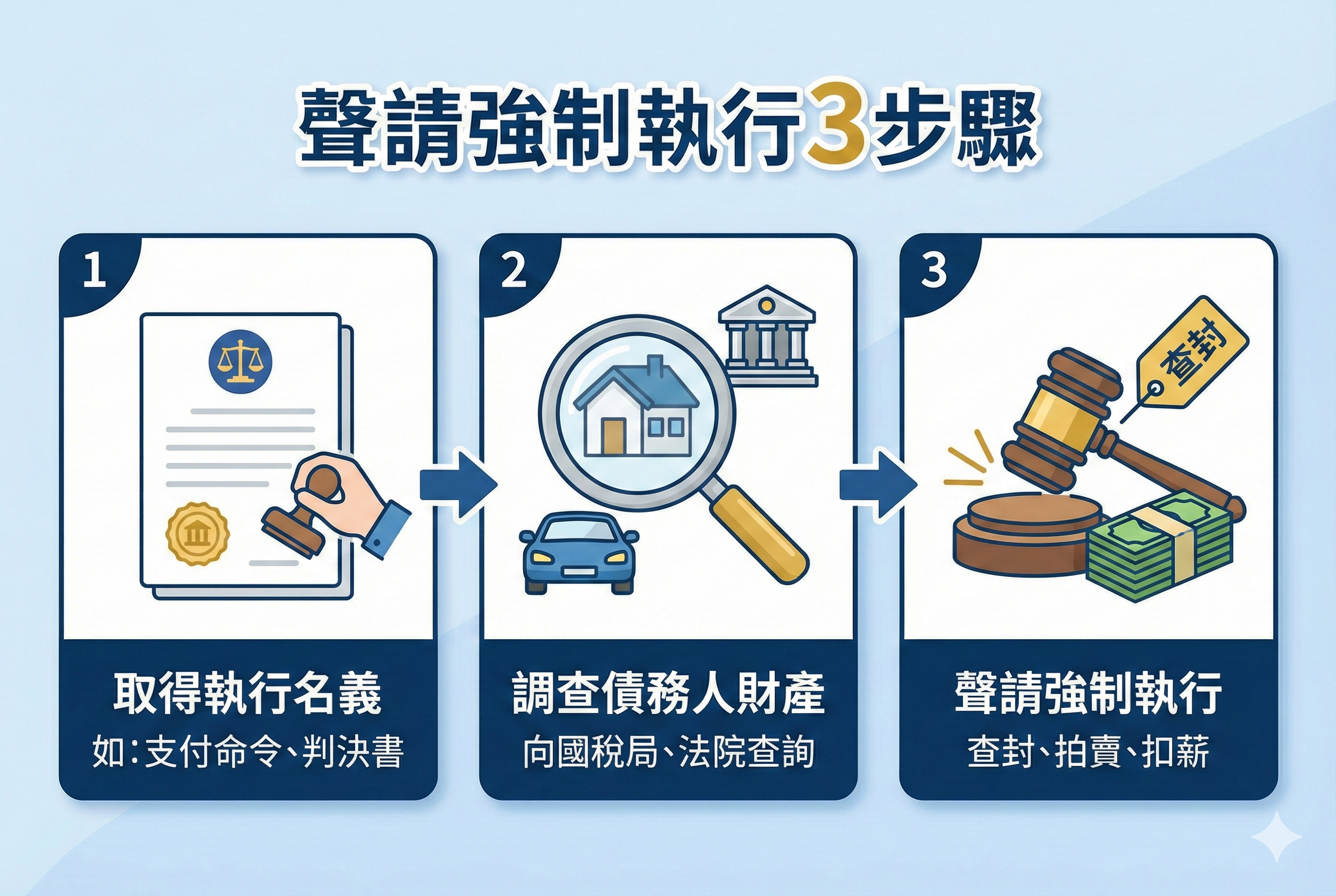有了執行名義後,法院不會自動幫你討錢,債權人必須「主動」跑完以下三個強制執行流程。