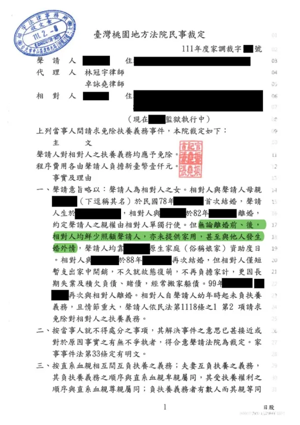 首頁 成功案例 成功案例 法律停看聽團隊業務涵蓋刑事、民事及家事糾紛等領域,憑藉律師們的專業知識與豐富辦案經驗,為每個案件擬定訴訟策略,為您爭取到最佳結果。 案件類型: 刑事案件 民事案件 家事案件 車禍案件 其他案件 不拘 離婚 免除扶養義務 確認親子關係 請求給付扶養費 酌定親權 酌定子女會面交往方式 夫妻剩餘財產分配 監護宣告 收養 夫妻分別財產制登記 拋棄繼承 酌定子女權利義務行使 變更未成年子女姓氏 返還代墊子女扶養費用 搜尋 酌定未成年子女會面交往方式 准聲請人得依其所述會面交往方案與未成年子女會面 當事人的前夫因為無心照顧未成年子女,且當初協定漏未考量子女就學的問題,導致當事人的影響未成年子女的就學及日常作息,故當事人尋求紀律師協助提出期望的會面方式,透過紀律師的專業協助,成功讓法官准用當事人提出的未成年子女會面交往方案。 丈夫長年施暴配偶及子女 對造同意離婚、當事人取得子女的單獨監護權 兩造雖結婚多年,但對造一直無法接受二名子女患有特殊疾病,導致其不喜愛和子女們互動,也時常藉故對當事人及子女施暴。惟當事人始初念及子女緣故,仍願相信對造願意改變,詎料對造始終不願改善。萬般無奈之下,當事人僅好尋求「法律停看聽」擅長處理家事案件的唐律師協助,最終成功在調解階段就讓雙方調解離婚,當事人也成功取得二名未成年子女的單獨監護,對造也同意按月給付扶養費用予當事人。 酌定未成年子女扶養費用及會面交往方式 對造應返還代墊款及按月給付扶養費用,並依約履行探視 兩造離婚後,惟雙方當時並未約定探視方法,對造也遲未定時給付扶養費用長達半年之久,是以當事人認為此情並非長久之計,最後決定委任「法律停看聽」擅長處理家事案件的唐律師,透過律師的協助下,最終成功爭取到當事人可以接受探視方式,以及確定對方每月應給付之扶養費用並要求對方返還過去當事人已經代墊的款項。 要求生父為未成年子女負責 原告取得單獨監護、被告應認領子女及按月給付扶養費用 兩造於遊樂場熟識並開始交往,交往期間雙方曾多次外出並同居,原告亦於同居期間懷孕,嗣後原告發現對造竟是有家室之人,遂決定和對方分手。冷靜過後,當事人認為應替未成年子女打算,最終決定委任「法律停看聽」擅長處理家事案件的唐律師,在律師的協助下,成功判決對造和未成年子女間的親權存在、原告取得未成年子女的單獨監護,被告每月應按時給付扶養費用。 請求給付剩餘財產分配及代墊扶養費 調解成立,對造同意給付剩餘財產分配及代墊扶養費 當事人婚後遭配偶要求將工作所得交由配偶管理,配偶每個月僅願意提供當事人3-4千元。然當事人要求額外生活費時對方卻以沒必要,沒錢等理由搪塞,而對方購買非生活必需品時卻從未和當事人討論。更甚者,當事人除房貸外,未成年子女的學費及其他生活開銷亦均負擔三分之二,在種種經濟壓力之下,當事人已無法忍受決定與配偶離婚。但離婚後找到「法律停看聽」的陳律師,透過陳律師從中調解,成功讓對造同意給付剩餘財產分配及代墊扶養費。 前夫長年積欠扶養費用 確定扶養費用金額及對造同意分期返還代墊扶養費 父母對未成年子女之扶養義務,不因結婚經撤銷或是離婚而受影響,夫妻在簽署離婚協議書時起都是當事人替前夫代墊數月扶養費,造成當事人經濟負擔過重,幸好找到「法律停看聽」的陳律師,成功替當事人在調解程序和對方達成共識,確定扶養費用金額及對造同意分期返還代墊扶養費 配偶婚後嗜酒,婚姻難以維持 成功調解離婚並成為監護權人 配偶婚後第五年起嗜飲酒水,當事人屢勸不聽,且夫妻雙方常因大小事紛爭不斷,爭執逐漸擴大難以挽回後,雙方合意分居。斯時開始,未成年子女便與當事人同住。爾後,長年不堪其擾的當事人找到「法律停看聽」的陳律師,在律師兩邊斡旋調解下,成功幫助當事人在法院調解離婚,並爭取到未成年子女的監護權。 夫妻失和離婚 成功離婚並成為主要照顧者 結婚起初當事人夫妻原相安無事,但自婚後第3年起夫妻時常因大小事情發生爭吵,導致雙方已無意願繼續維持婚姻;且前妻因宗教信仰致多年不願和當事人行房,又經常不願報備其上下班時間,常常找不到人,造成當事人僅能獨立負責未成年子女上下學接送及照顧;平日對造更將雜物堆積在房間、樓梯等空間引發衛生環境問題,對配偶失望又無奈下,當事人最終尋求「法律停看聽」的陳律師,透過律師成功向法官證明夫妻以難以維持婚姻之事實,更替當事人爭取成為未成年子女的主要照顧者。 配偶不願照顧子女及維持家庭 成功順利離婚、取得未成年子女監護權 雙方結婚不久即分居兩地,子女出生後配偶也鮮少探視未成年子女,當事人身兼父職的情況已嚴重影響當事人維持婚姻的意欲。在數次溝通和配偶溝通無效下,僅好尋求游律師的協助提起離婚訴訟,最後成功幫當事人離婚並取得未成年子女的單獨監護。 離婚事件 離婚成功 當事人和配偶結婚將近20年,未料配偶某天竟無預警離家,未留下聯絡方式,行蹤不明,致當事人一家無法聯繫到配偶。本以為後續無法順利離婚,還好當事人找到「法律停看聽」的鄭律師,在鄭律師的專業協助下,成功透過訴訟說服法官當事人遭配偶惡意遺棄,准許當事人與配偶離婚。 請求離婚 成功