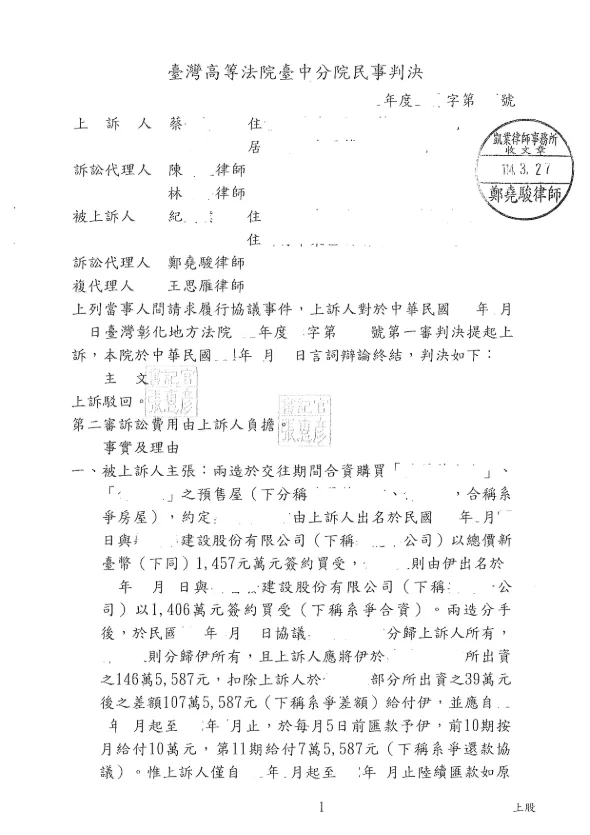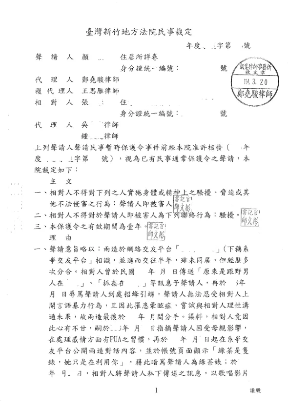 首頁 專業團隊 王思雁 律師 成功案例 王思雁 律師 擅長案件:刑事犯罪、車禍事故、消費糾紛、債務糾紛、遺產、繼承、贈與、婚姻、監護、家事 刑事案件 貸款竟涉犯洗錢 成功爭取不起訴 當事人收到詐騙集團佯裝銀行貸款專員的訊息,詢問有無需要申請貸款,並稱要美化帳戶求當事人提供帳戶,當事人因急需用錢便交付帳戶。事後當事人遭通知變成人頭帳戶後才驚覺自己被騙,幸好找到「法律停看聽」的王律師,透過王律師的經驗和專業,成功說服檢察官替當事人爭取到不起訴。 找工作竟涉犯洗錢 成功爭取緩刑 當事人接獲詐騙集團佯裝某公司傳送徵才訊息,當事人為了想增加收入,且當下並無發現對方說法不合理之處,因此聽信詐騙集團所言,將帳戶交付出去,事後才發現自己成為警示帳戶有幫助洗錢的疑慮,所幸找到「法律停看聽」的王律師,透過律師專業的答辯和經驗,成功說服法官及和被害人們達成和解,替當事人爭取到緩刑。 客戶匯款竟是不法所得,帳戶慘遭為人頭戶 成功爭取不起訴 當事人從事線上遊戲幣商一職,從事買賣交易時收到的款項,竟是詐欺集團透過詐術要求受害者的匯款。正當當事人不知該如何處理時,幸好找到「法律停看聽」的王律師,事後在王律師的專業協助下,在偵查階段幫當事人爭取到不起訴,成功替當事人刷洗冤屈。 借友人帳戶,真心被踐踏遭利用成人頭戶 爭取緩刑3年 當事人一時失慮誤信友人說詞,將帳戶提供給友人使用,詎料帳戶竟遭友人不法利用,導致當事人變成警示帳戶。而當事人想說只要誠實告知檢察官案件始末即可爭取不起訴,沒想到還是遭檢察官起訴。正當當事人不知如何是好時,幸好找到王律師的協助,並在律師的幫忙下在一審時陪和被害者成功達成和解,最後成功爭取到緩刑3年。 遭詐騙集團欺騙匯款至人頭帳戶 成功爭取百萬賠償金額 當事人被詐騙集團以徦交友真詐財的話術陷入錯誤,將多達百萬的款項匯入詐騙集團提供的人頭帳戶,事後驚覺自己被騙的當事人找到「法律停看聽」的王律師,透過律師的專業及經驗,成功爭取被告應賠償當事人的所有損失。 投資竟涉嫌洗錢 成功爭取緩刑 當事人因投資過程中遭詐騙集團的話術而提供帳戶,事後帳戶卻被通知變成人頭帳戶,當事人情急之下便找到「法律停看聽」的王律師,透過律師的專業答辯,成功說服法官而替當事人爭取到緩刑的處分。 貸款竟遭利用成為人頭戶 成功爭取無罪判決 當事人家裡急需一筆資金,於是到網路上找貸款,未料竟遇到詐騙集團,爾後當事人聽信詐騙集團的說詞提供帳戶,自行處理下遭檢察官起訴。幸好後續找到「法律停看聽」的王律師,透過王律師的專業答辯,成功替當事人在一審時爭取到無罪,免除賠償義務也無刑事責任。 加重詐欺 成功爭取無罪 當事人在網路上找打工,知悉工作內容只要代客領取、轉送包裹,竟沒想到是遭詐騙集團利用,成為掩護詐騙集團詐欺犯行的取簿手,當事人在偵查階段被起訴及一審階段被判有罪,在二審時才意識到事情的嚴重性,幸好找到「法律停看聽」的王律師,透過律師的專業答辯和經驗,成功替當事人爭取到無罪。 小三篡位不成竟對人夫提告 成功爭取不起訴 已婚當事人身為補習班主管,與女下屬婚外情交往一段期間,女下屬因不滿當事人久久不向正宮提離婚,由愛生恨憤而提告當事人妨害性自主,當事人手足無措之下找到王律師,在律師的協助下,成功幫當事人爭取到不起訴。 打分手炮竟遭前任提告 成功爭取不起訴 當事人與前女友談判分手期間因為舊情未了發生了關係,事後前女友因復合不成由愛生恨提告當事人妨害性自主,當事人無奈之下找到「法律停看聽的」王律師,最後在律師的協助下,成功替當事人爭取到不起訴。 一同出遊遭被告妨害性自主 成功爭取不起訴 當事人與一群友人出遊,在眾人抵達民宿後,女性友人主動詢問當事人是否願意同房共枕,當事人見女方不排斥下當下立即答應。爾後,雙方又在兩情相悅下發生關係,未料女性友人隔天一早卻後悔昨晚一時的衝動,竟直接到警局作筆錄提告。幸好當事人找到「法律停看聽」的王律師,透過律師的仔細蒐證、整理完整案發過程提供給檢察官參考,最終成功幫當事人爭取到不起訴。 女業務賺不到業績,竟告客戶妨害性自主 成功爭取不起訴 當事人因買酒結識賣酒女業務,兩人相約面交時竟天雷勾動地火去旅館開房間,事後卻因當事人反悔不向女業務買酒,女業務憤而提告妨害性自主,手足無措之際當事人找到王律師,透過王律師的協助成功替當事人爭取到不起訴。 一夜情,隔天竟被告妨害性自主 成功爭取不起訴 當事人於交友軟體上認識女網友,兩人發生一夜情,兩人後續亦有相約第二次性行為、約吃宵夜。一年後女網友卻因當事人與其友人發生嫌隙,為了替友人出氣,憤而提告當事人妨害性自主,還好當事人找到「法律停看聽」的王律師,透過王律師的專業答辯,成功替當事人爭取到不起訴。 組隊打球竟遭對手提告過失傷害 成功爭取不起訴 告訴人和當事人原在同一球場打球,過程中兩造發生碰撞,告訴人認為當事人惡意出腳導致自己受傷,因而前往報警提告當事人。所幸當事人找到擅長處理刑事案件的王律師,在律師的專業協助下,向檢察官聲請傳喚證人、還原案發狀況,成功向檢察官說明當事人並無惡意傷害告訴人一事,且證人所述多與告